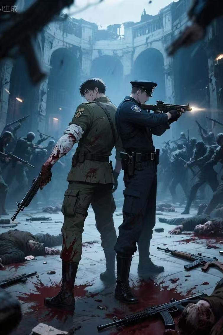 兩個男,背靠著背,將槍,對準面方湧敵。